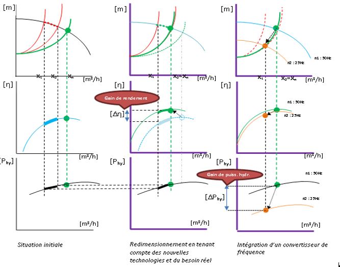 Dans la situation initiale, on observe que la pompe travaille à débit variable, entre les deux courbes de charge rouges. Le réglage est assuré par une vanne.