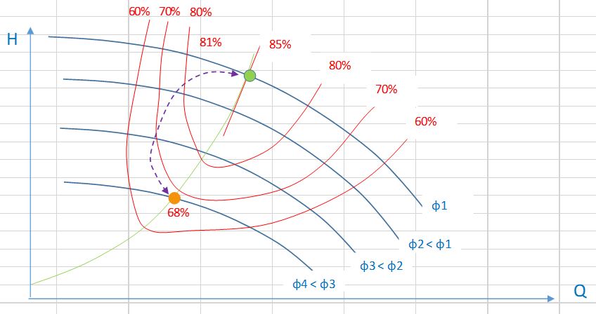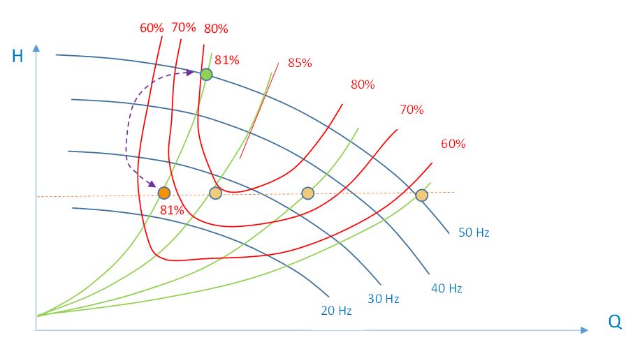 Lorsque l’on considère l’évolution du rendement d'une pompe fonctionnant à vitesse variable, il faut tenir compte de la perte de charge.
